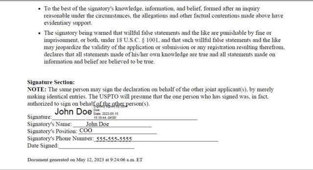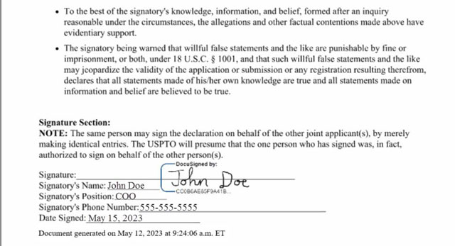 (d) Signatory must be identified. The first and last name, and the title or position, of the person who signs a document in connection with a trademark application, registration, or proceeding before the Trademark Trial and Appeal Board must be set forth immediately below or adjacent to the signature.